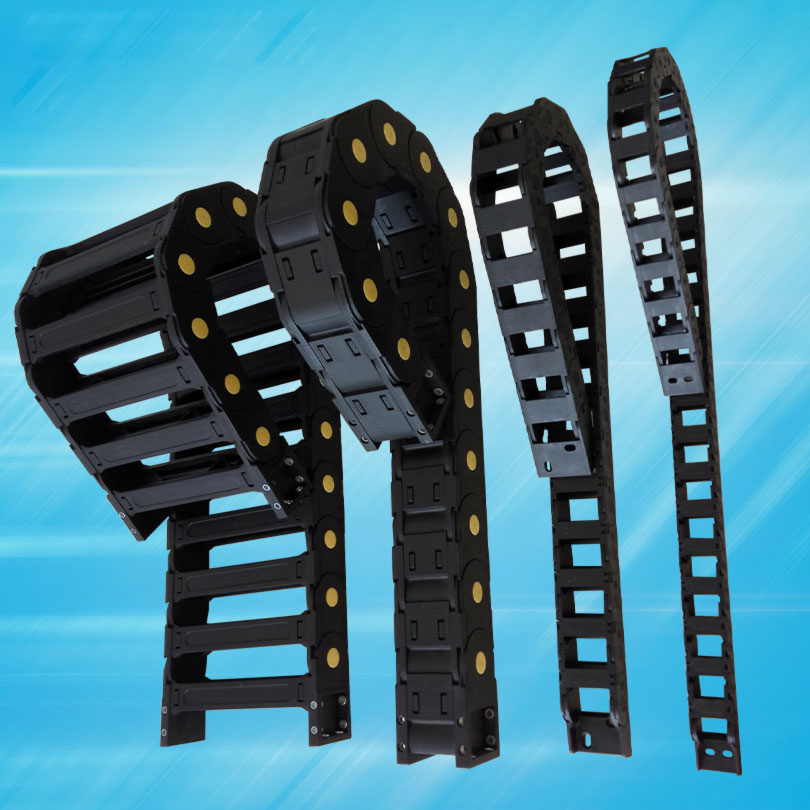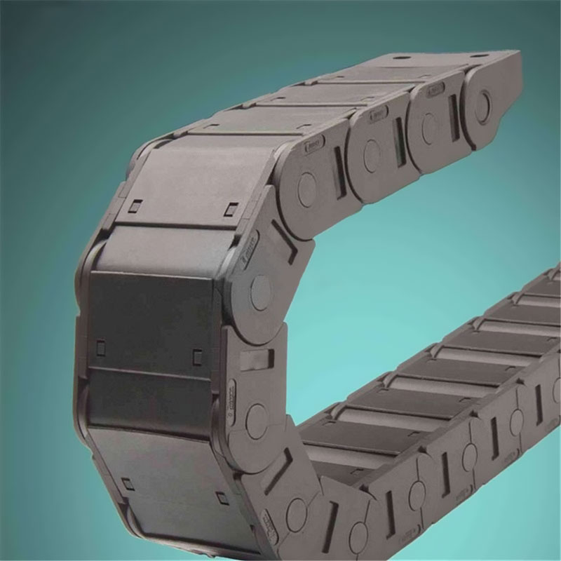 (3)單元鏈節(jié)由左右鏈板和上下檔板(橋式)或蓋板(全封閉式)組成,拖鏈每節(jié)都能打開(kāi),裝拆方便,不必穿線,打開(kāi)蓋板后即可把電纜、油管、氣管、水管等放入拖鏈。